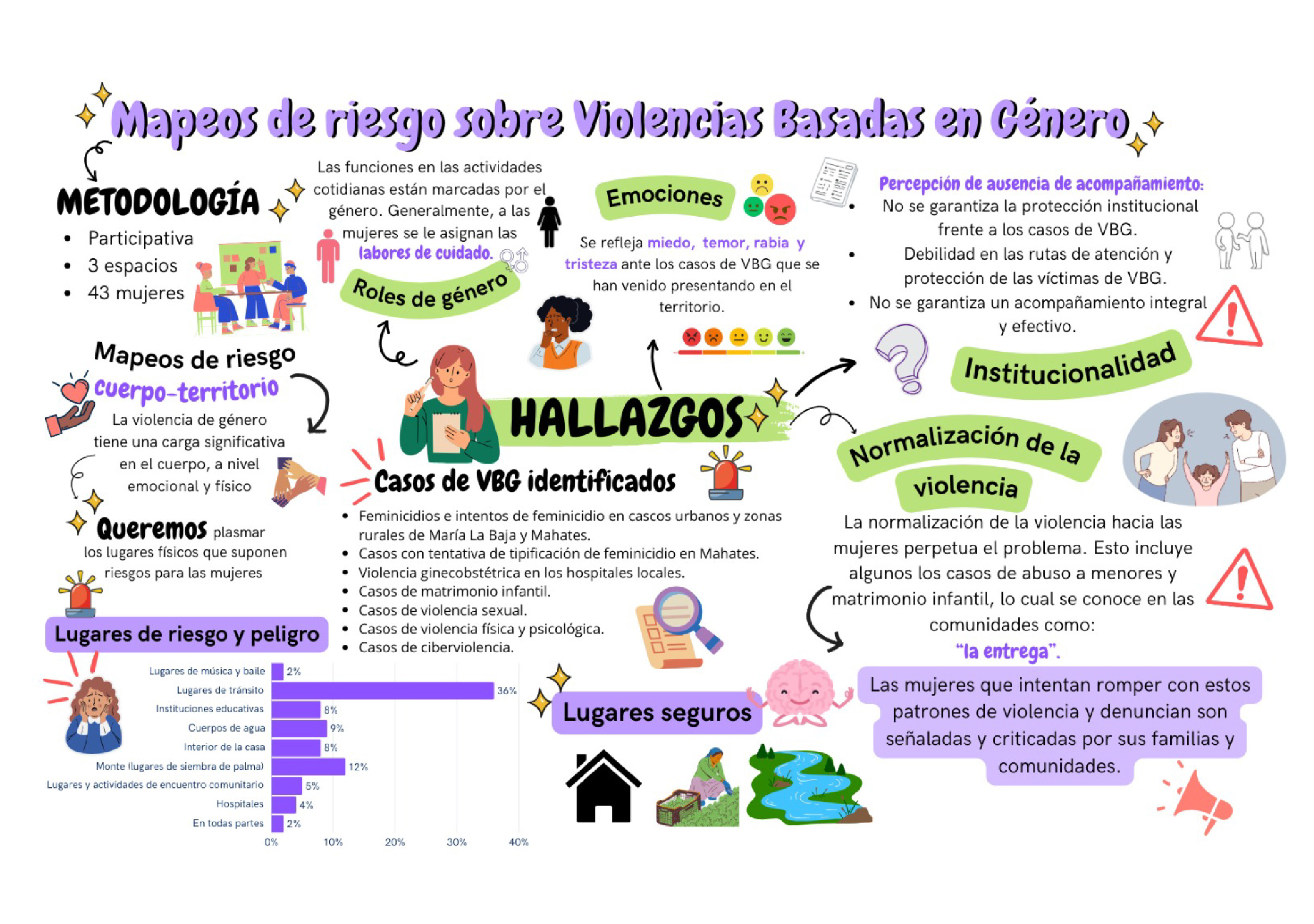 En los municipios de María La Baja, Mahates y San Juan Nepomuceno, mujeres rurales, jóvenes y lideresas comunitarias participaron en un proceso colectivo para mapear los riesgos asociados a las violencias basadas en género (VBG). El mapeo se realizó con enfoque corporal y territorial, con el propósito de comprender cómo las mujeres viven la violencia en sus entornos cotidianos y cómo emociones como el miedo, la desconfianza, la tristeza o la tranquilidad, protección y fortaleza, estan directamente entrelazadas con lugares específicos que simbolizan seguridad o peligro. Cada trazo del mapa r...