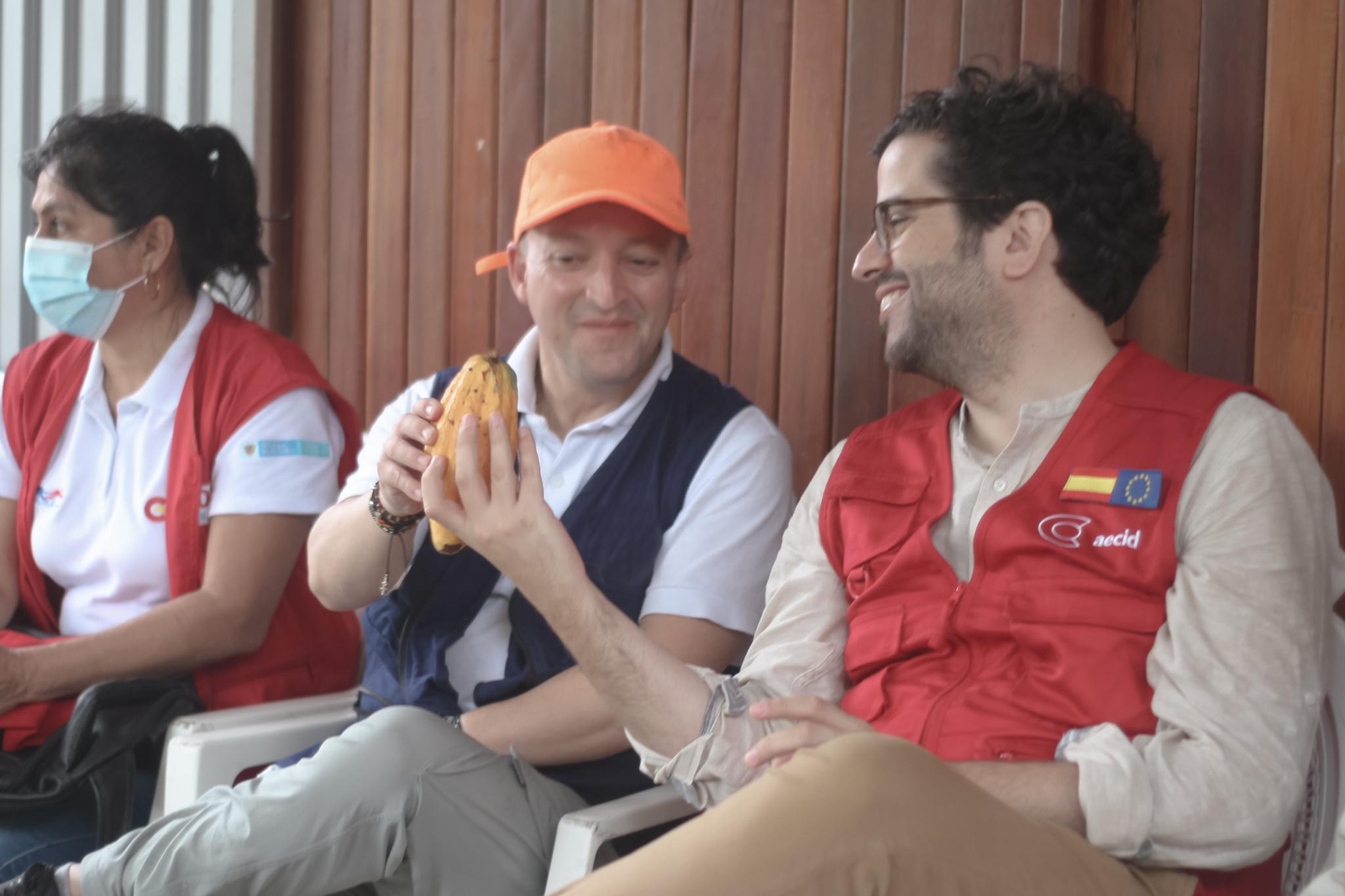 El director general de la AECID, Antón Leis García, en compañía del coordinador en Nariño de Ayuda en Acción, Mauricio López. Y delegados de la Cooperación Española, visitaron fincas cacaoteras en Tumaco, donde se implementan diferentes proyectos con la inversión de la Agencia Española. Cooperación Internacional para el Desarrollo, en beneficio de las comunidades y la construcción de paz en el pacífico nariñense. Durante el recorrido por la vereda Juan Domingo, conocieron de cerca los cultivos de cacao y el proceso postcosecha, donde se implementan procesos de producción más limpia, para mejorar los ingresos de las organizaciones y la calidad de vida de las familias cacaoteras beneficiarias de los proyectos.